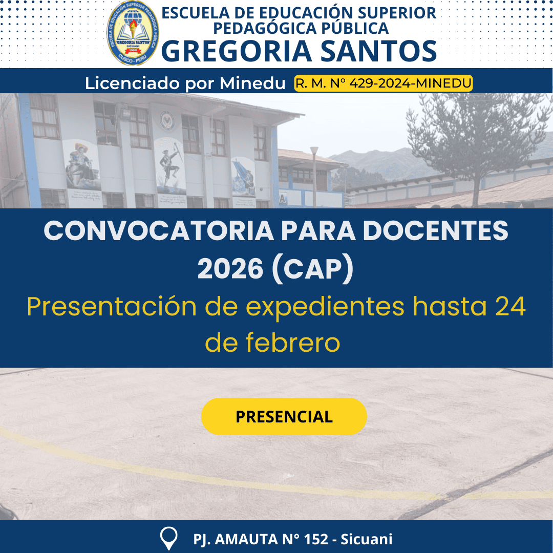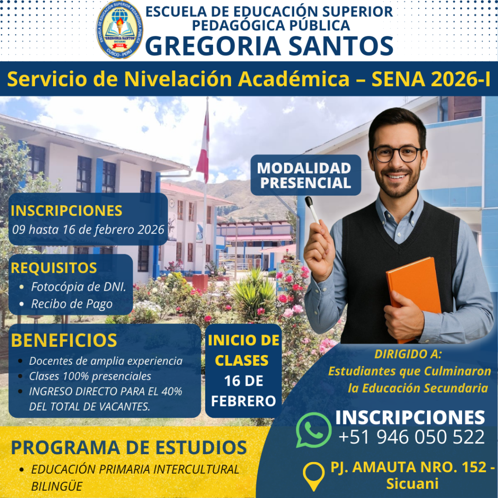 Bienvenidos al portal web del Instituto de Educación Superior Pedagógico Publico “Gregoria Santos” de Sicuani, invitamos a todos los que desean conocernos y nos visitan a través de nuestra página web Institucional. Deseo que a través de ella puedan encontrar la información que buscan y que este primer acercamiento genere en ustedes el deseo de conocernos mejor. El EESPP. Gregoria Santos dedicado a la formación de Profesores en Educación Primaria Intercultural Bilingüe e Idiomas especialidad: Ingles, con una duración de 5 años