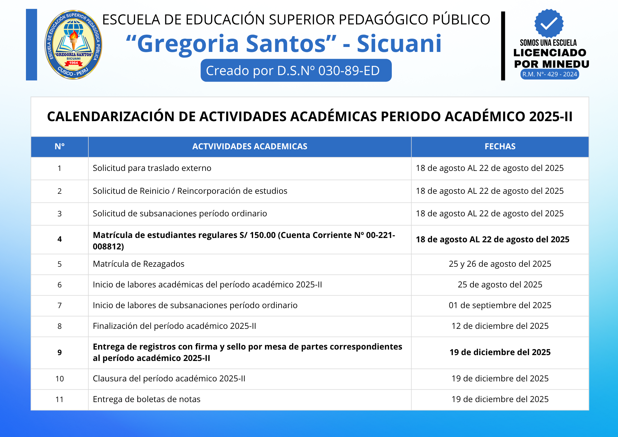 - Realizar el pago de S/. 150.00 por derecho de matricula a la Cuenta Corriente N° 00-221-008812 a nombre del IESPP. Gregoria Santos.