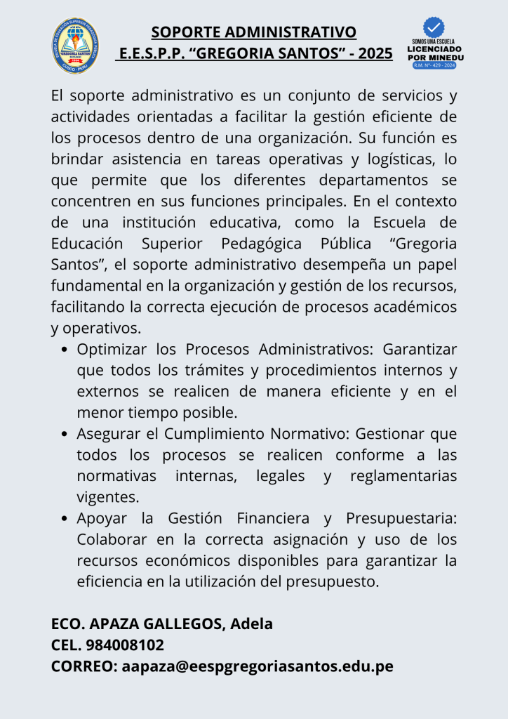 - Apoyar a la dirección en la administración de recursos del I.E.S.P.P.” Gregoria Santos”